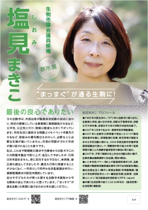 - 2024/08/04 「塩見まきこ市議会ニュースレター2024年夏号」をアップしました。「プロフィールの議会活動」に最新の情報を追加しました。プロフィールを更新しました。